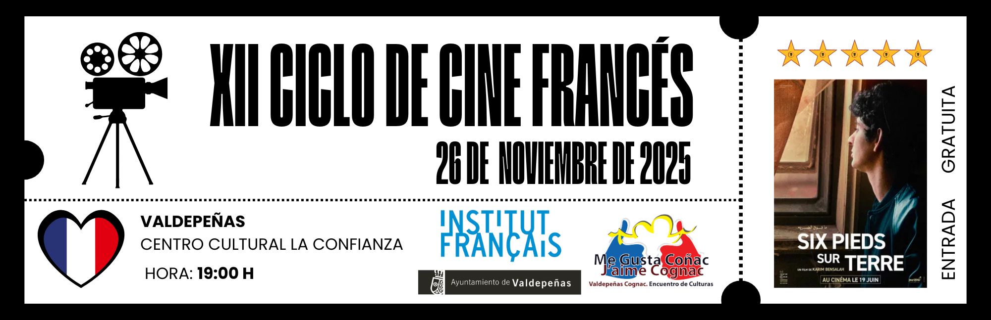 XII Ciclo de Cine Francés. Proyección de la película “SIX PIEDS SUR TERRE” + Añadir Google Calendar + exportación iCal / Outlook Tags:cultura, Cultura Valdepeñas, Programación cultural Organizador Concejalía de Cultura y Turismo En común Localización Centro Cultural "La Confianza" Calle Real, 9, 13300 Valdepeñas Categoría Actividades culturales