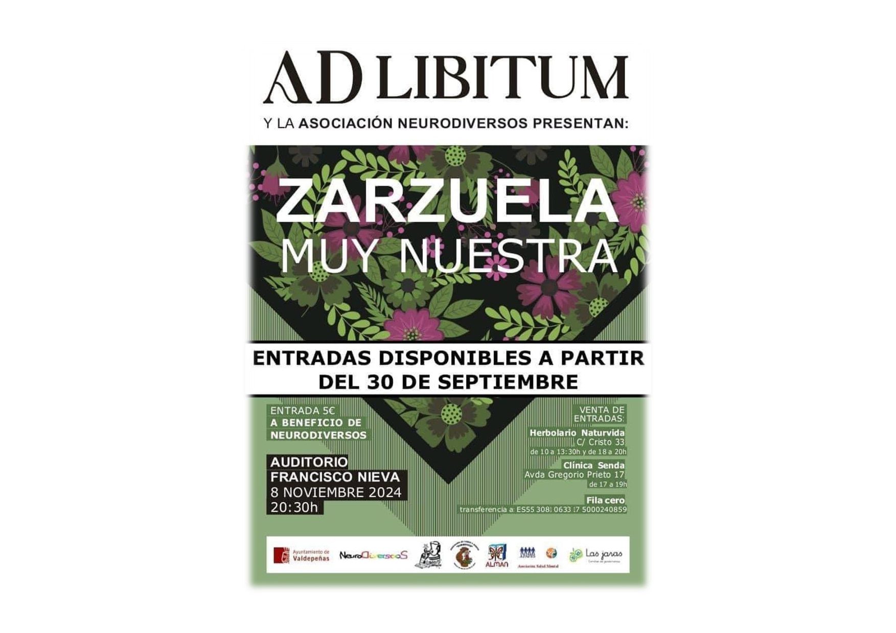 El viernes 8 de noviembre a las 20.30 horas en el Teatro-Auditorio “Francisco Nieva” Ad Libitum y la Asociación Neurodiversos presentan “Zarzuela muy nuestra”. El precio de la entrada, a beneficio de Neurodiversos, será
