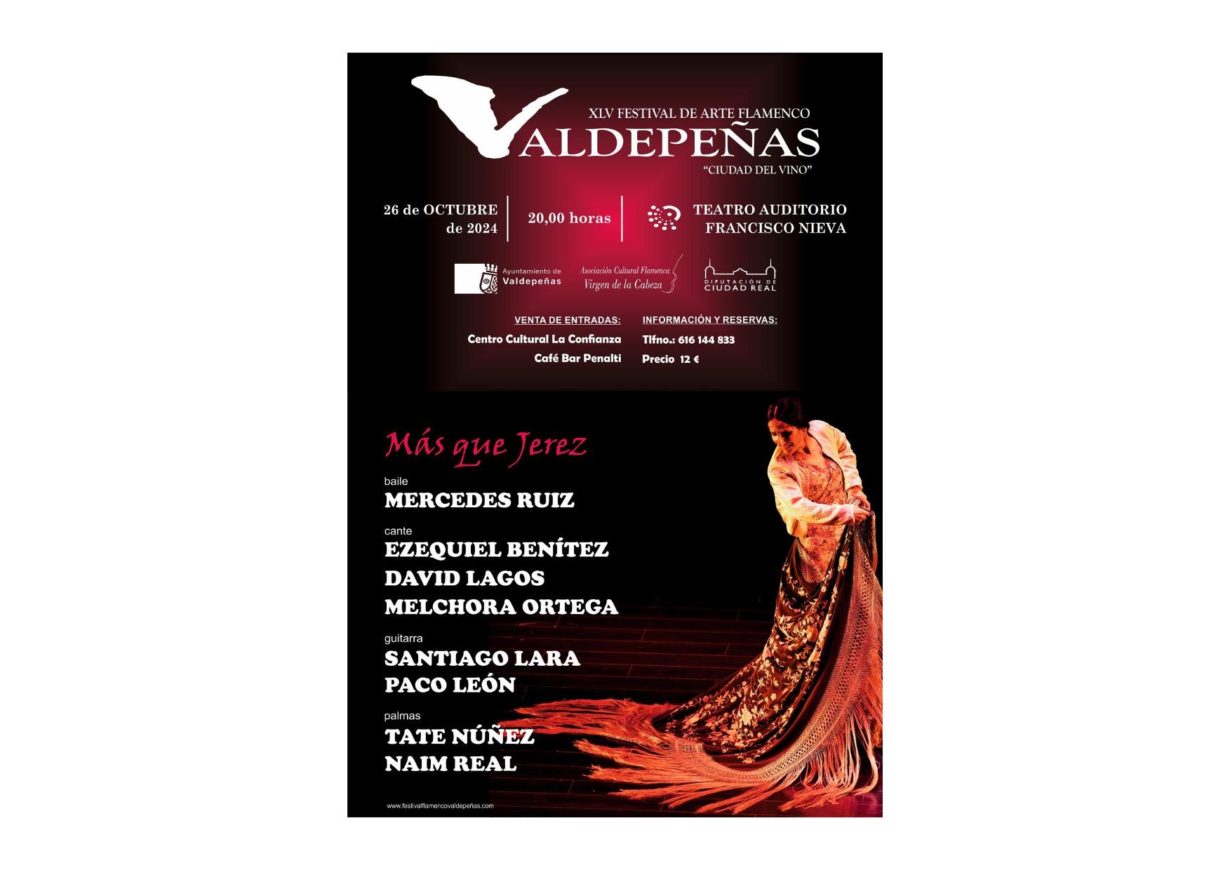 Mercedes Ruiz y Ezequiel Benítez protagonizan el espectáculo “Más que Jerez”. Baile: Mercedes Ruiz Cante: Ezequiel Benítez, David Lagos y Melchora Ortega. Guitarra: Santiago