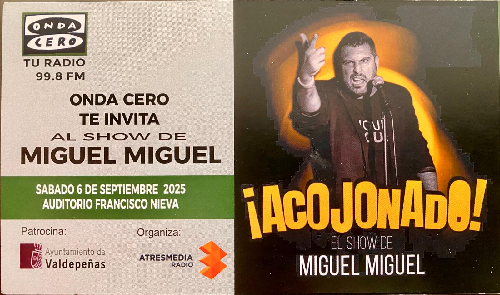 ¡ACOJONADO! DE MIGUEL MIGUEL 26 de agosto de 2025 ¡Acojonado! es el nuevo show de Miguel Miguel, en el que recupera todas sus experiencias vividas en todos estos años. Es una mezcla de lo