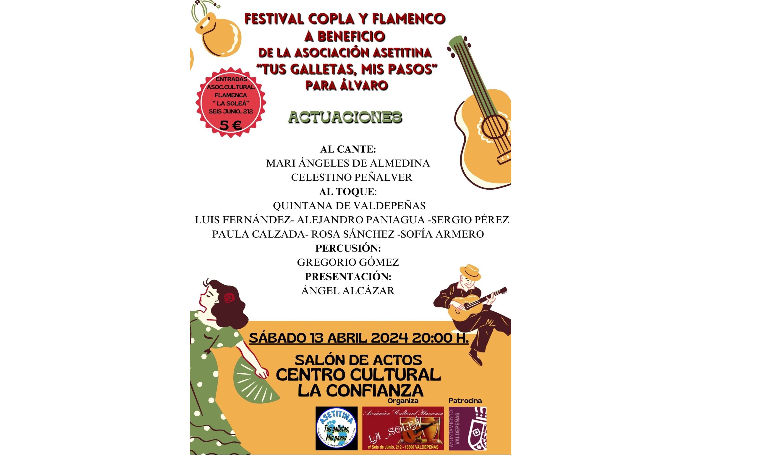 El sábado 13 de abril, a las 20.00 horas en el Centro Cultural “La Confianza” se celebrará un Festival de Copla y Flamenco a beneficio de la Asociación Asetitina (Álvaro) “Tus Galletas, mis pasos”, organizado por la